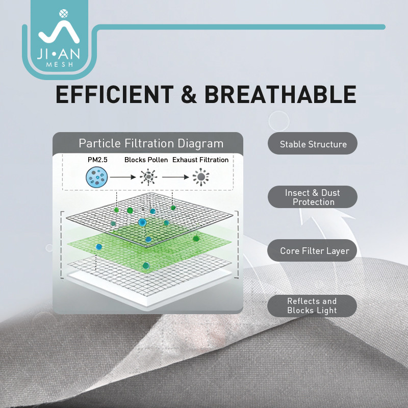 The Multi-Layer Composite Anti-Smog Screen Mesh is a 3-layer functional window screen for high-pollution environments. The outer PET 20-mesh layer blocks insects and coarse dust, the middle high-density non-woven layer efficiently filters PM2.5, pollen and vehicle exhaust particles, while the inner 60-mesh polyester layer provides light reflection and shading with good airflow. With durable PET and polyester construction, it offers long-term outdoor weather resistance, ideal for residential windows, offices, schools and hospitals requiring cleaner indoor air.