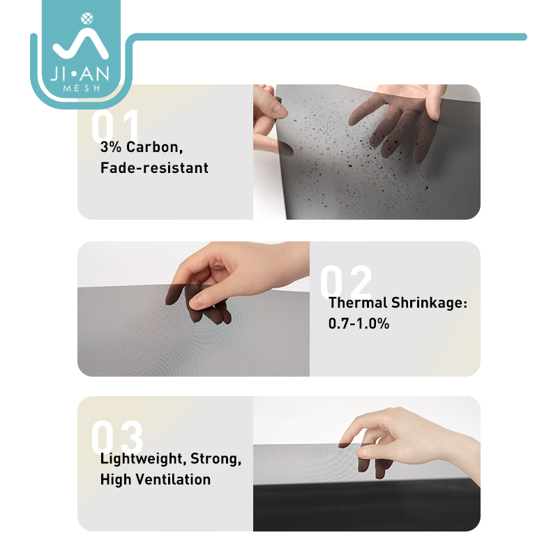 60 Mesh Tiantu PET Insect Screen is a high-density polyester insect screen designed for premium windows and doors. Made from high-strength PET with 60 mesh and approx. 0.12 mm filament, it effectively blocks fine dust, pollen and tiny insects while maintaining good airflow and visibility. The 3% carbon black formulation offers excellent UV resistance and long color stability after 1000 h UV testing. With very low thermal shrinkage and outdoor durability, it is ideal for invisible screens and anti-pollen window systems.